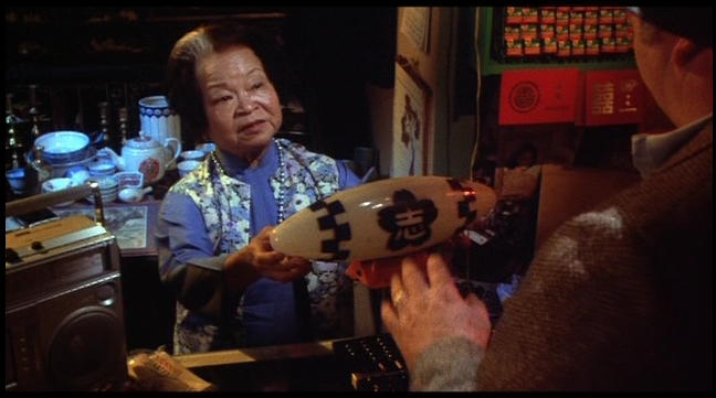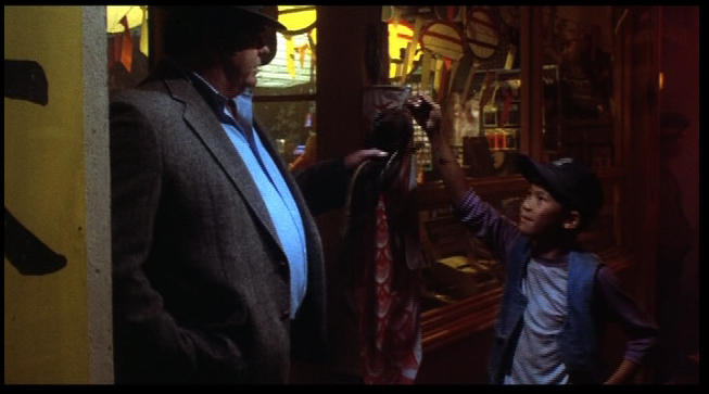 Rand Peltzer passes by while looking for a unique present for his son for Christmas. Rand meets up with a shopkeeper that doesn’t quite understand what he means by something “unique” or “different” so she keeps bringing out strange objects for him to buy. (A 9-volt battery, some kind of blimp thing) This was also menat to hint at why he names the Mogwai what he does, as he is looking for “Some kinda gizmo”. While the shopkeeper goes in back to find a “gizmo” for him, a young boy approaches him,