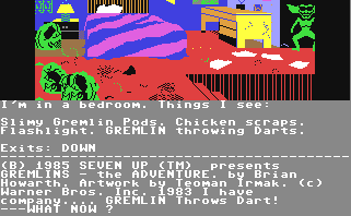 Gremlins: The Adventure was a text-based adventure game that had you taking the role of Billy from the movie, and have to travel through various locations seen in the film to thwart the gremlins menace. This is considered tobe one of the better Gremlins games, as it stays very true to the movie, and it manages to keep the horror/comedic tone that made the film so popular.